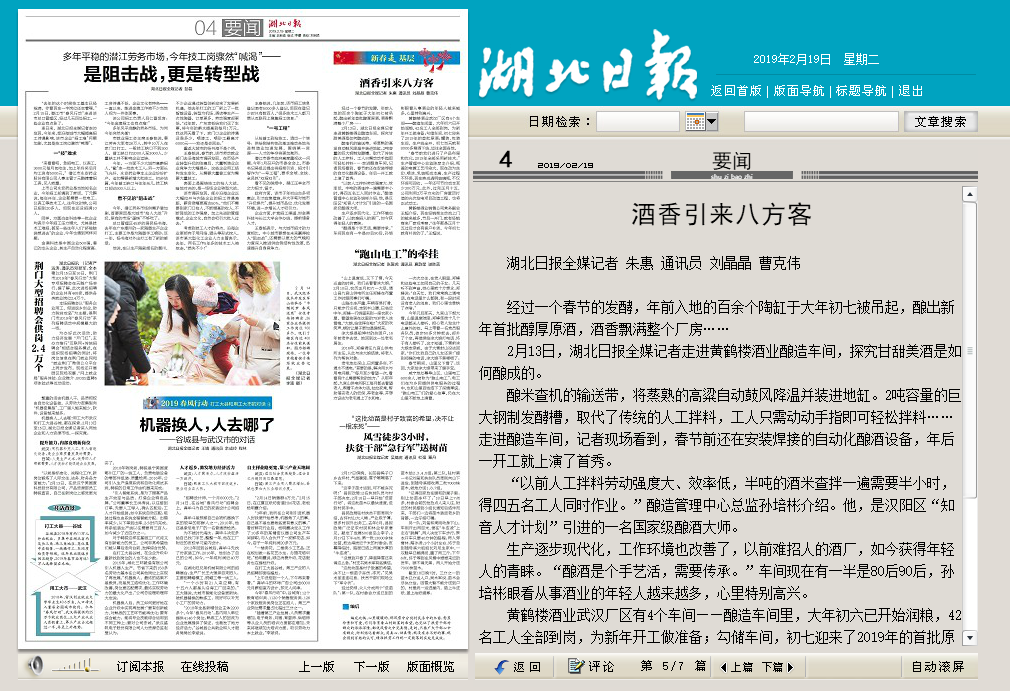 黃鶴樓酒業武漢廠區有4個車間——釀造車間里,大年初六已開始潤糧,42名工人全部到崗,為新年開工做準備;勾儲車間,初七迎來了2019年的首批原酒;罐裝、包裝車間,生產線全開,初七當天就有8000多箱酒下線,運往全國各地。“春節前我們進行了產品布局和優化,2019年全部采用新技術。”生產管理中心總監陳彥龍介紹,瓶蓋的電鍍工藝污染大,現在改為絲印、噴涂,乳玻瓶成本高、生產過程不環保,現在換成透明玻璃瓶,不僅環??苫厥?,一年還可節約成本至少300萬元。此外,過完正月十五,公司利用2萬平方米的廠房屋頂打造的光伏發電項目改造工程,也將正式動工。